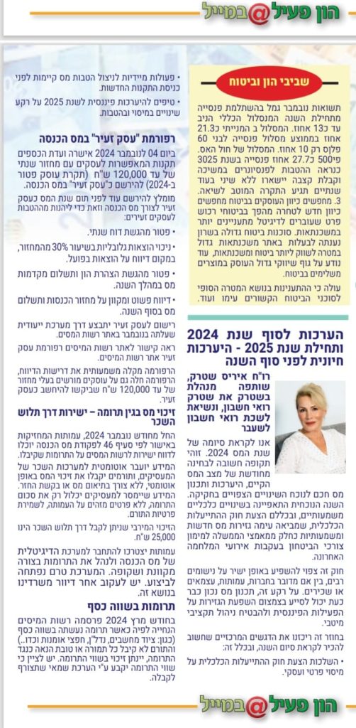 כתבה מ"ידיעות אחרונות" בהשתתפותה של רו"ח איריס שטרק בנושא גזירות 2025